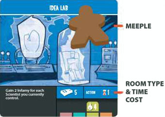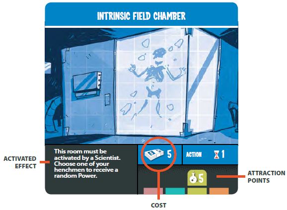 For example, if you build a Robotics Lab, Scientists will be attracted to your base. Room cards can also be activated by your henchmen for bonuses, making it easier for you to complete contracts and gain Infamy.