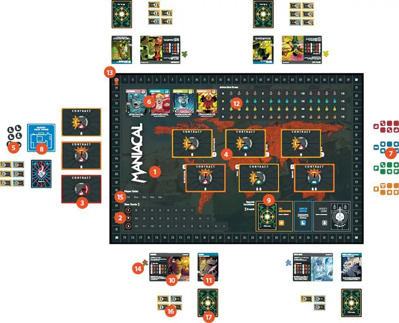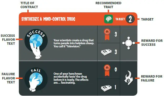 Each player in MANIACAL takes on the role of a comic book Supervillain. Your goal is to earn the most Infamy points through 3 rounds of play. Infamy is primarily gained by completing contracts (such as, Steal a Nuclear Warhead) that appear on a world map.