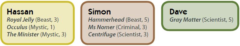 Again, the player with the highest Attraction Score in beasts recruits this henchman. It may be the same player who recruited the first Beast. Repeat this exact process for Criminals, Scientists, and Mystics, so that 2 of each type are recruited.