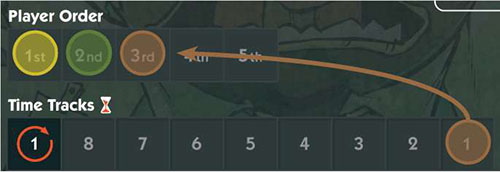 When you are active player, you may decide to pass. Immediately spend the remainder of your time and move your Time token to the next available, leftmost spot on the Player Order track.