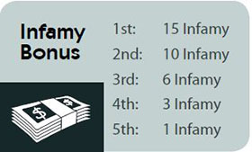 At the end of Round 3, the players should collect an Infamy bonus based on how much money they have relative to the other players. The player who has the most money gets the "1 st place" bonus, etc.