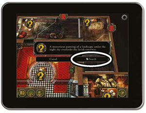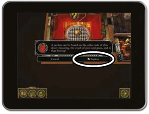 The investigator uses the app to explore an adjacent room.To do so, he taps the Explore token that corresponds to the area he wants to explore. Then he confirms his action by selecting the "