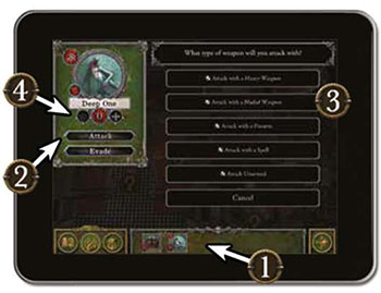 After selecting his attack type, he resolves the effect-which often includes a skill test-as instructed by the app. The investigator uses the "+" and "-" buttons in the monster menu to record the damage the monster has suffered 4.