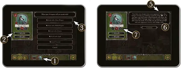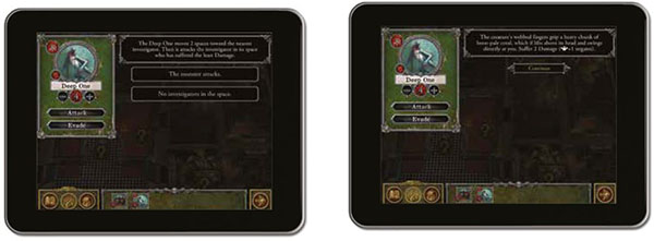 The Deep One attacks the investigator in its space who has suffered the most Damage. Agatha selects the "The monster attacks". option, and the app generates the effects of the Deep One's attack.