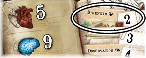 The investigator resolves the effect as instructed by the app which might include a skill test, declared as a skill icon embedded in parentheses following a short narrative.