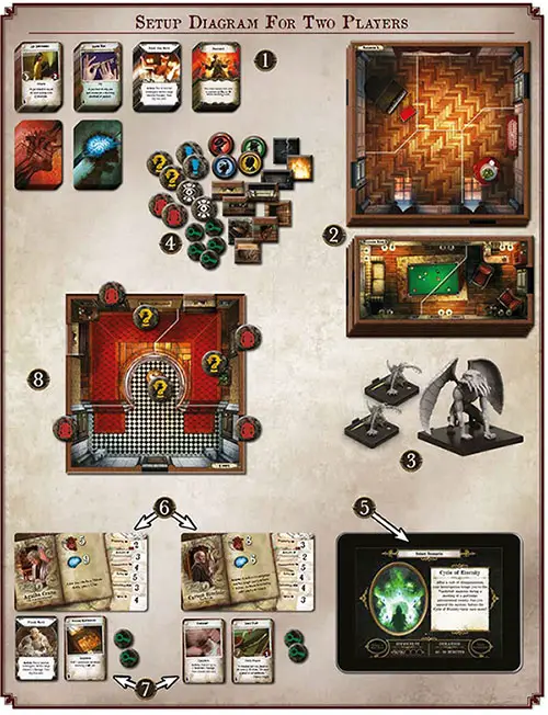 Before choosing a scenario, if you own the first edition Mansions of Madness base game and/or any of its expansions, you can integrate the components of those products as described by the Conversion Kit rules insert.