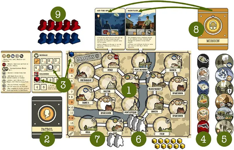 First, check the Morale track to determine how many Patrol pawns will be placed this Day. Then, beginning with the player, Resistance Workers and Patrols are placed back-and-forth, one pawn at a time.
