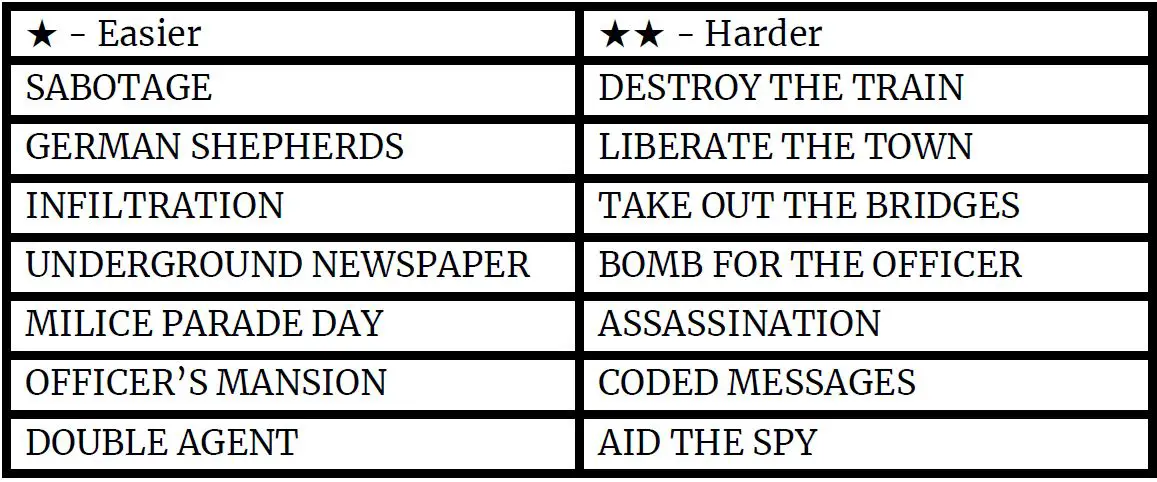 You have 15 Days to complete 2 Missions before the Occupation discovers you. If successful, the Resistance has won. However, if the town's Morale drops to zero, or all 15 Days run out, the Occupation succeeds in crushing the Resistance.