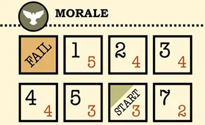 Each space on the Morale track shows a black number-the Morale of the town-and a red number, which is the minimum number of Occupation Patrols that Day.