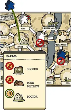 If all three Locations are occupied, the Patrol attempts an arrest instead of patrolling a Location. To attempt an arrest, check the Locations on the Patrol card from the top again.