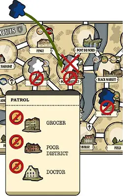 Draw a card from the Patrol deck. The Patrol card lists three Locations on the board where a Patrol pawn can be placed. If the first Location on the card does not contain a Resistance Worker or any Patrol, place the Patrol in that Location for this Day.