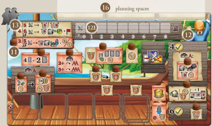 - one of their markers onto space 8 of the doubloon income track, and the last of their markers onto space 0 of the victory point income track.
