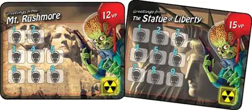 When targeting a monument, you must roll Martians. Any Martians you roll apply toward destroying the monument and cannot be re-rolled. Monuments provide a lot of VP, so it is more difficult to claim them.