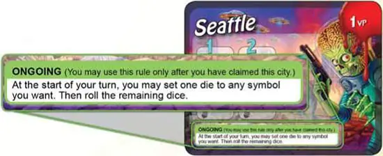 Special rules outlined in green are active only after the card has been claimed. These rules are labeled as ONGOING on the card and remain in effect for the rest of the game for the player who claimed the card.