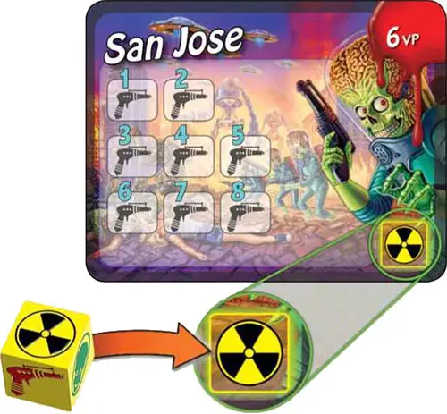 After rolling the dice, if you have not been nuked, but have not met the requirements to claim your targeted card, you have two options: continue your turn by re-rolling all of your Martians, or stop and end your turn.