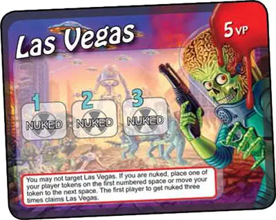 Once you have rolled enough matching symbols to meet the requirements on the targeted card (if you have not been nuked), you must claim that card. Resolve any special rules and place that card face-up in front of you. All players should be able to see your total VP and any ongoing special rules you have available to use.
