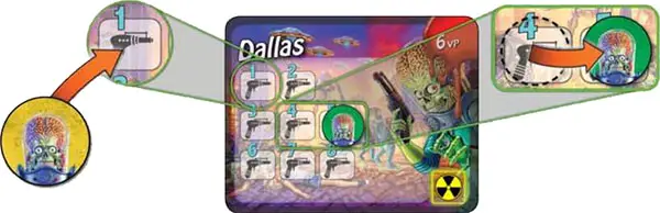 Place one of your player tokens on the numbered space that matches the number of Martians you rolled. If you already have a token on that card, move your token to show the new total.