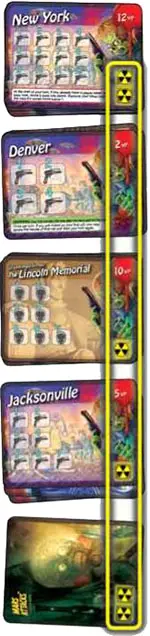 Some cards show Nuke symbols in the numbered spaces. The numbered spaces never apply toward getting nuked. Only the Nuke symbols in the lower-right corner of the cards in play apply toward being nuked.