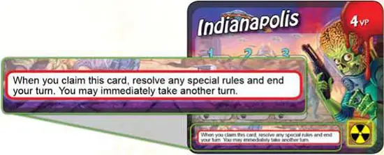 For example, Indianapolis allows you to take an additional turn immediately after the turn in which you claimed the card.