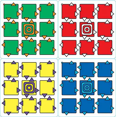 These colorful beverage coasters form a gameboard that changes during the game. Why the name Martian? Because the fictional origin of these pyramids is in the lost, ancient cities of the planet Mars.