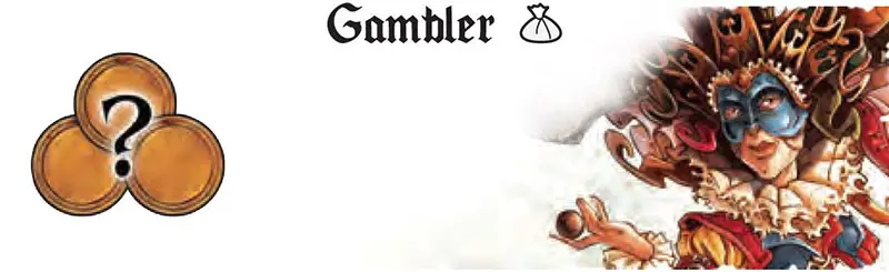 The Gambler takes 3 coins from the bank and hides 1, 2, or 3 of them in her fist. She then chooses another player who must guess the number of coins. If the player guesses correctly, that player wins the coins.