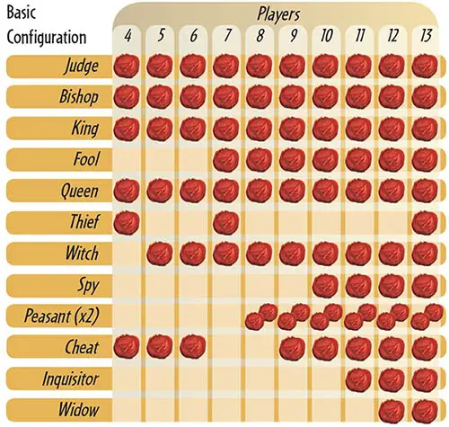 A minimum of one-third, if not more, of the characters should bring money from the bank into the game play. These characters are: Queen, King, Widow, Fool and the Peasants.