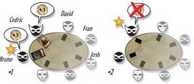 Example: Bruno announces "I'm the Inquisitor". Fran calls his bluff and also claims to be the Inquisitor. Bruno and Fran reveal their card. Bruno is the Inquisitor, Fran is the Queen. Bruno chooses another player, Cedric, and asks what he believes his character to be. Cedric answers "I'm the Judge" and reveals his card, a Peasant. Cedric pays four gold coins to Bruno, as he didn't guess his card correctly. Fran pays a fine of 1 gold coin to the courthouse. The cards are returned to their face down positions and play moves on.
