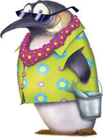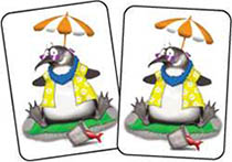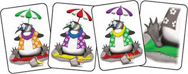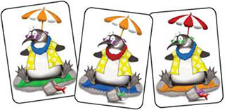 Take a moment to get familiar with the cards. Notice that most cards show a picture of a penguin with six different colored elements: umbrella, sunglasses, lei, shirt, blanket and fish in a pail.