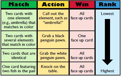 If you spot two cards with several matching elements, grab a black penguin pawn. If all players agree you were right and there were no higher-ranked matches, you win ONE of the face up cards.