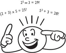 Note how each number is used once and only once in each equation. This rule is especially important to understand when the numbers are used as powers. The player who hit 28 used the "2" to raise the 5 to the second power; the player who reached 27 used the "3" to raise (5 - 2) to the third power.