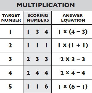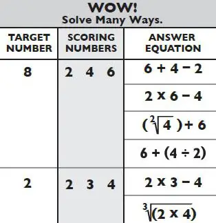 To get you started down this path, we've developed eight Practice Tables that you can use to hone your skills. The first five tables each focus on a different operation, and the final three WOW! Tables show examples with multiple ways of reaching the Target Number.