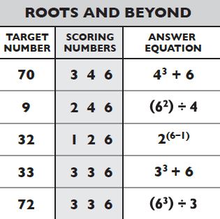 To create your equation, use each Scoring Number once and only once, along with any combination of the following operations: addition, subtraction, multiplication, division, powers, and roots. You may use the Scoring Numbers and operators in any order.
