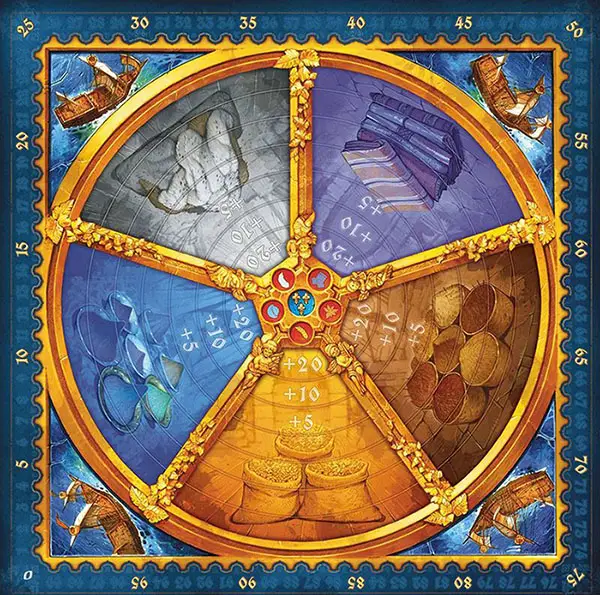 The next step is to count the number of purchases each player has made in the five commodities (cloth, fur, grain, dye, and spice). The commodities are scored one at a time. Each player moves their counter up on every triangular track by the number of cards of that type currently on their ship.