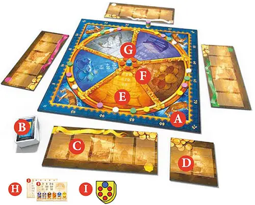 A7 game board for tracking money and purchasesB36 cards - 7 each depicting cloth, fur, grain, dye and spice (with values 0, 1, 2, 3, 4, 5, 5) and 1 gold card (with value 10)C6 large ship mats, one in each of the six player colorsD2 smaller ship mats (to be used in the 2 player game)E36 playing counters, six in each of the six player colors (*)F5 red commodity scoring countersG2 blue day tracking countersH2 scoring aid cardsI7 start player token
