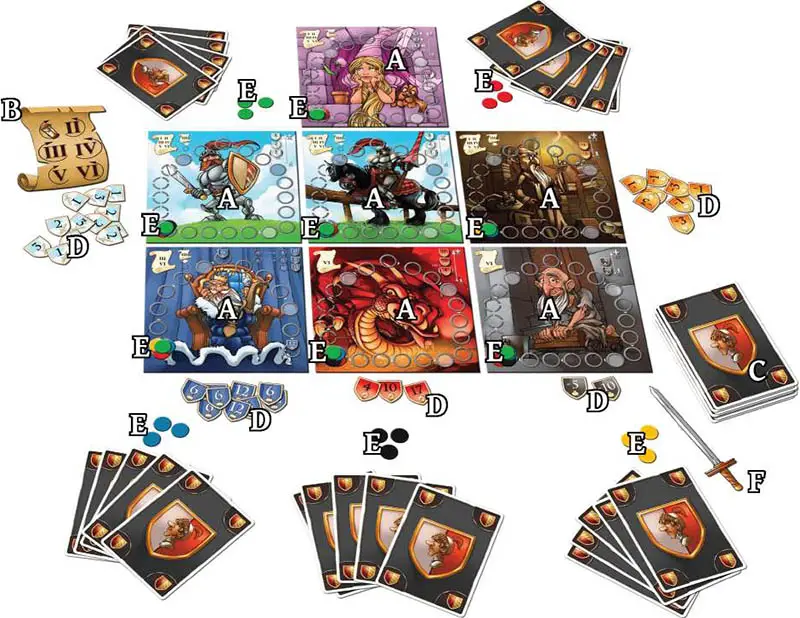 Each player takes the role of a squire, who wants to outdo the others in the different training categories, to score Chivalry Points (
