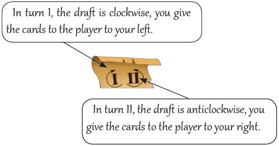 Draft direction: The parchment used to count the turns also tells you the direction of the draft. It means that you will give your cards alternatively to the player to your left and the player to your right.
