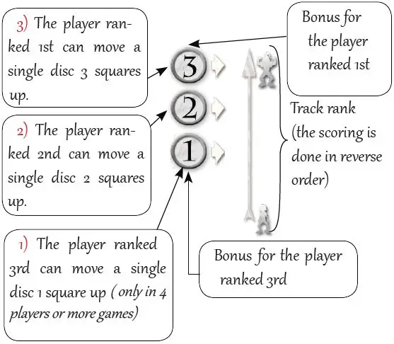 - The player ranked 3rd chooses one of his discs, on any game board, and moves it one square up on the track.