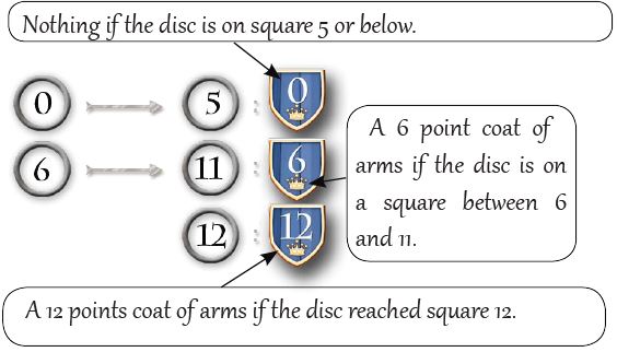 Note: the rank of the players on the Gallantry game board is determined at the start of the scoring phase, if a player decides to use his bonus to move his disc on the Gallantry game board, it does not change his rank for the current scoring phase.