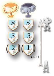 The Player ranked 1st on the victorious knight's track gets a 8 Chivalry Points coat of arms, the player ranked 2nd on that same track gets a 5 Chivalry Points coat of arms, and in 4+ player game, the player ranked 3rd gets a 2 Chivalry Points coat of arms.
