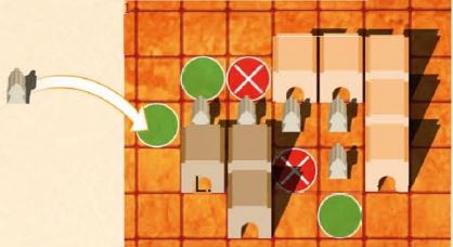 Merchants must be placed orthogonal adjacent to a merchant already present on the board. Newly placed merchants are always adjacent to one merchant at the beginning or the end of the market street and may never be adjacent to two merchants.