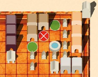 If a palace of the same color without a rooftop exists, any player play- ing a building of that color must built adjacent to this palace. This means it needs to be placed on an orthogonally adjacent space. A pal- ace can become quite large when many buildings of the same color are placed next to each other.