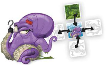 Exchange the octopus with a horizontally or vertically adjacent (not diagonally) Location. It does not matter if this Location is unrevealed or revealed. Important: In this case you have to change the positions of Locations on the island.