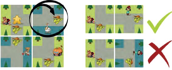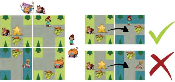 If the fairy tale character shown on the flipped forest tile is next to the action card, you do NOT move your player piece. Instead, you must perform the action adjected to the fairy tale character. You may not skip this action. All actions are in relation to your view of the playing area.