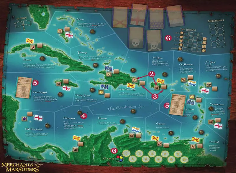 The top-center of the board is used for placing NPC Captains as they are drawn In the top-right corner is a table for tracking NPC damage ("The Enemy!") and spaces for placing defeated "Merchants" tokens. Lastly, at the bottom of the map, you will find the Glory Point track ranging from 0-10.