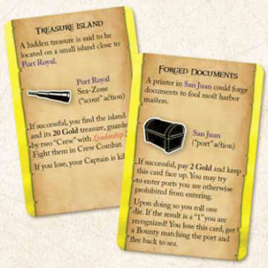 Rumors typically require you to go to a specific port or Sea-Zone and roll either Influence or Scouting during a "port" or "scout" action (indicated with a skill icon). When taking the required action, present the rumor and roll the skill required. If you fail the roll, the rumor was false and the card is discarded. If successful you obtain what was promised by the rumor.