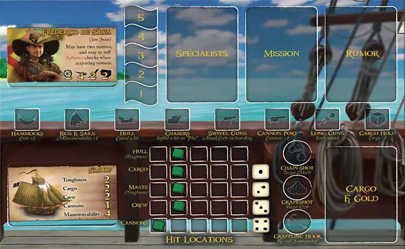 Each player gets a Player Board. The Player Board is used to keep track of Cards, Gold, Cargo, and the condition of your ship.