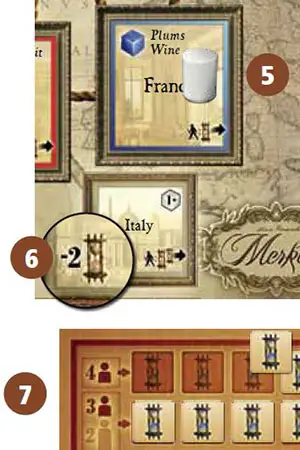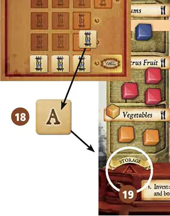 18. All players must return 1 good of their choice from the respective column of their office19. If the counter has a double letter, all players lose 2 goods of their choice from that column.The loss of goods applies to all players, not only to the player who triggered the check.