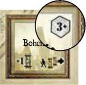 Example: Bohemia has 3+. If a player travels there, all Major locations that already have at least 3 cubes get another one. Newfoundland has 0+.