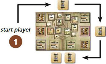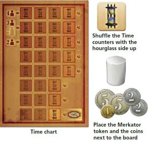 The starting player gets no Time counters. The player sitting to his right gets 2 Time counters, and all other players get 1 Time counter from the supply 1.