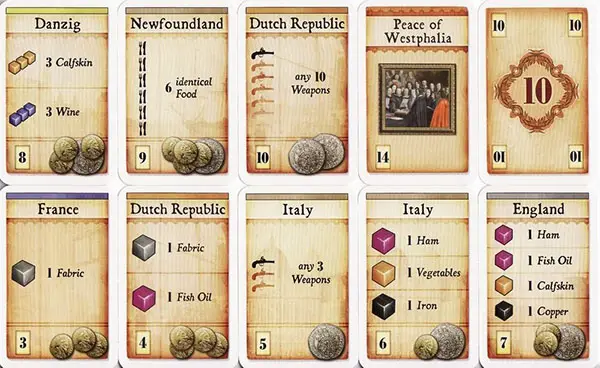 Prepare a face-down stack of Contract cards. Put the Peace of Westphalia card on the bottom of that stack, then add the shuffled value 10 Contracts, the shuffled value 9 Contracts and the shuffled value 8 Contracts. This stack is called "the Solo stack". (Place the remaining Contract cards as in the standard game).
